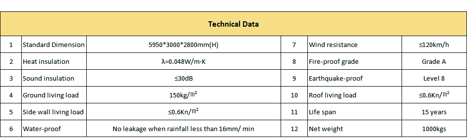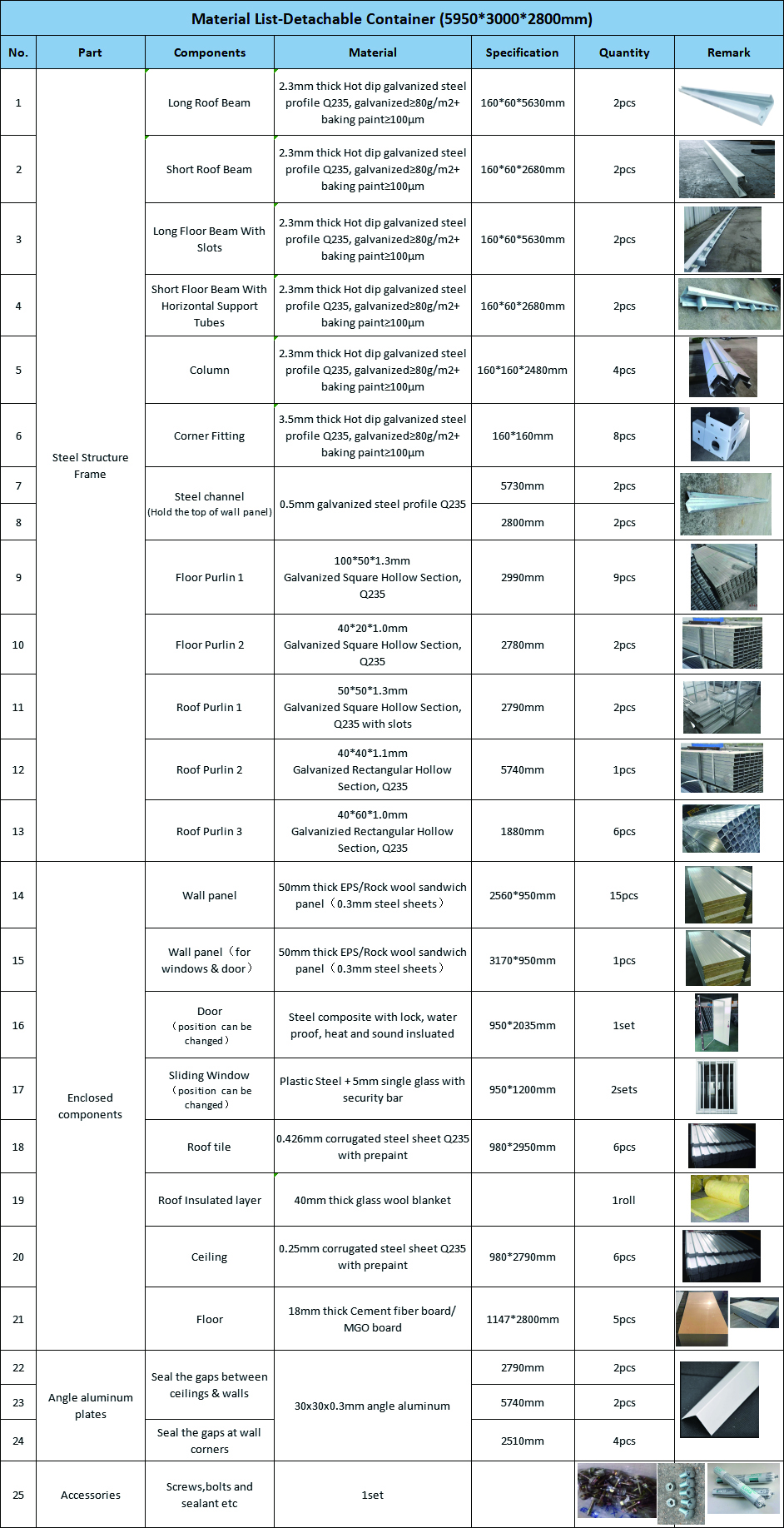 The standard dimension of the detachable container garage is 5950*3000*2800mm(H)  and customized dimension is available. And it is available to use thicker material to get better technical data if needed.
